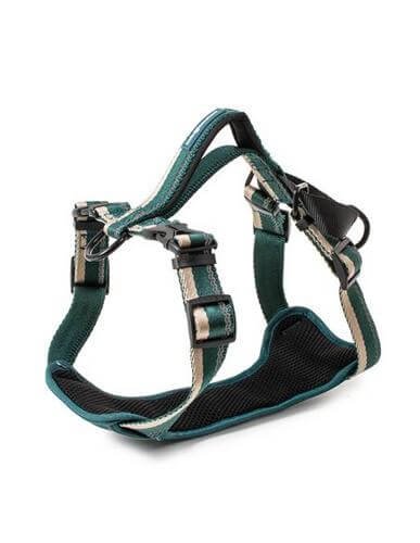 Arnés en Y: reparte la presión sobre el esternón; perfecto para cachorros. Arnés de trabajo: acolchado dorsal y asa de control rápido. Collar martingale: impide que el perro se escurra sin ahogar. Correa multiposición: ajustable a 1 m / 1,5 m / 2 m con mosquetón de seguridad.