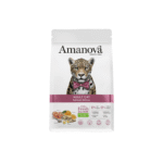 Amanova Adult Cat Salmon Deluxe se elabora exclusivamente con salmón preparado en fresco como única fuente animal, sin harinas de carne ni carnes deshidratadas, garantizando una nutrición hipoalergénica altamente digestible. Su fórmula low grain incluye camomila, que favorece el sistema digestivo y ayuda a aliviar el estrés; calcio y fósforo mantienen dientes y huesos fuertes, mientras que los ácidos grasos omega-3 (EPA y DHA) contribuyen a una piel saludable, un pelaje fuerte y articulaciones cuidadas. Además, contiene fibras dietéticas, minerales y componentes funcionales como psyllium, probióticos, quinoa y aceite de pescado, que mejoran la función renal, estimulan una digestión saludable y ayudan a prevenir la formación de bolas de pelo.