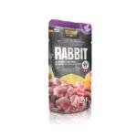 Formulada con conejo (carne, corazón, hígado) 63%, caldo 27%, mijo cocido 4%, boniato 4%, aceite 0,5%. Receta completa en práctico formato sobre individual, perfecta para una ración fresca sin desperdiciar.