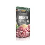 Formulada con pavo (carne, corazón, hígado, molleja) 63%, caldo 27%, amaranto 4%, guisantes 4%, aceite 0,5%. Receta completa en práctico formato sobre individual, perfecta para una ración fresca sin desperdiciar.
