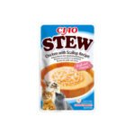 Snack húmedo con pollo y vieira en caldo para gatos adultos que disfrutan de sabores del mar