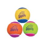 KONG SqueakAir Pelotas de Cumpleaños son versiones festivas de las populares SqueakAir Tennis Ball, con diseño de celebración. Combinan pelota de tenis y squeaker en un juguete de busca perfecto con fieltro no abrasivo que protege los dientes del perro.