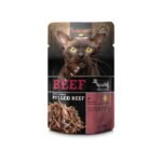 Comida húmeda premium con textura pulled beef de ternera para gatos adultos