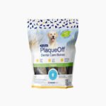 PlaqueOff Bones Veggie ha sido desarrollado para promover la salud oral de los perros mediante un sistema de acción doble. Su ingrediente activo A.N ProDen® actúa en el organismo reduciendo la formación de placa, disolviendo el sarro existente y previniendo su acumulación. Al mismo tiempo, la textura abrasiva del hueso ayuda a limpiar los dientes de manera mecánica, refrescando el aliento y mejorando la higiene bucal en pocas semanas. Este suplemento natural incluye ácidos grasos omega 3 y 6, junto con antioxidantes, que refuerzan el sistema inmunitario y contribuyen al bienestar general del animal.