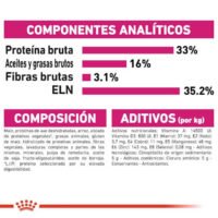 Incluye proteínas de ave de corral deshidratadas, grasas animales, arroz, gluten de trigo, harina de maíz, fibras vegetales, proteínas animales hidrolizadas, gluten de maíz, harina de trigo, maíz, levaduras, minerales, pulpa de achicoria, aceite de pescado, aceite de soja, fructo-oligosacáridos, psyllium, aceite de borraja y harina de tagetes. Análisis: proteína bruta 30.0%, grasa 22.0%, fibra 4.6%, ceniza 7.5%, omega 6 4.9%, omega 3 1.0%.