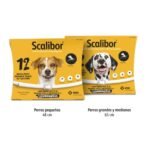 Scalibor es un collar antiparasitario para perros con una duración de hasta 12 meses de efecto repelente frente a flebotomos, responsables de transmitir la Leishmaniosis. Ofrece protección durante 6 meses contra mosquitos del tipo Culex pipiens, previene infestaciones por garrapatas durante 6 meses y por pulgas durante 4 meses. Apto para perros desde las 7 semanas de edad, es resistente al agua y seguro también en hembras gestantes y lactantes.