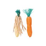 Incluye dos juguetes con forma de vegetales, uno simulando una zanahoria y otro una mazorca.